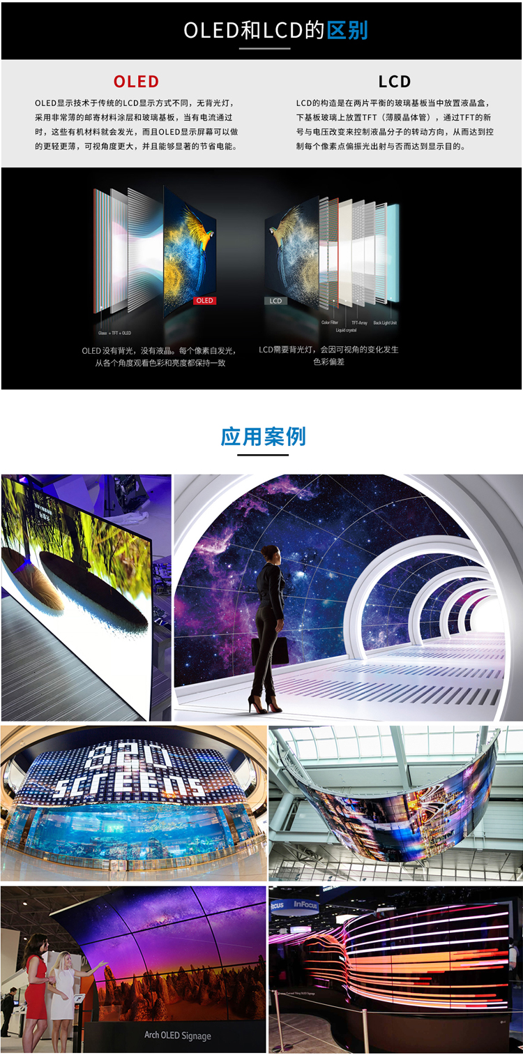 OLED柔性顯示屏產品說明:OLED是有機分子薄膜組成的,可以由電產生光的固態設備,與傳統的LED和LCD相比,由OLED槎做成的屏幕更薄,更亮。